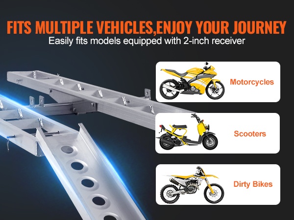 Teline sopii monenlaisille moottoripyörille, maasto- ja crossipyörille sekä skoottereille. 2-tuumainen / 5.1 cm vetokoukun vastaanotin mahdollistaa telineen nopean kiinnityksen useimpiin henkilö- ja pakettiautoihin.