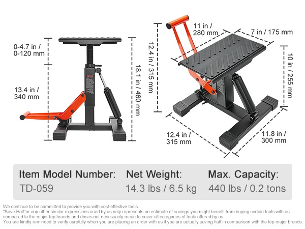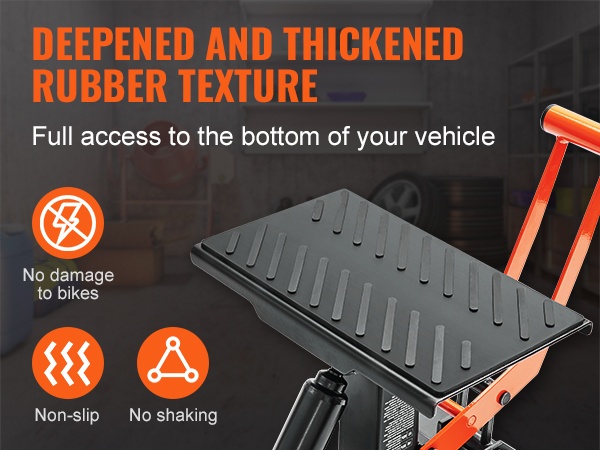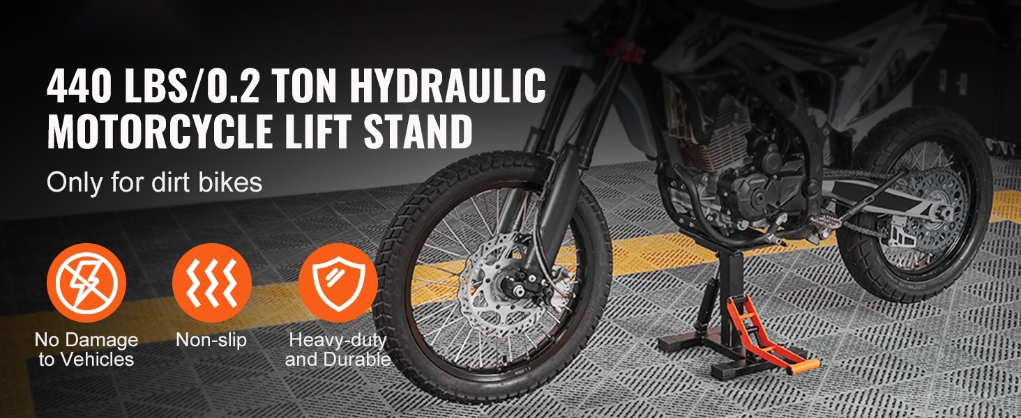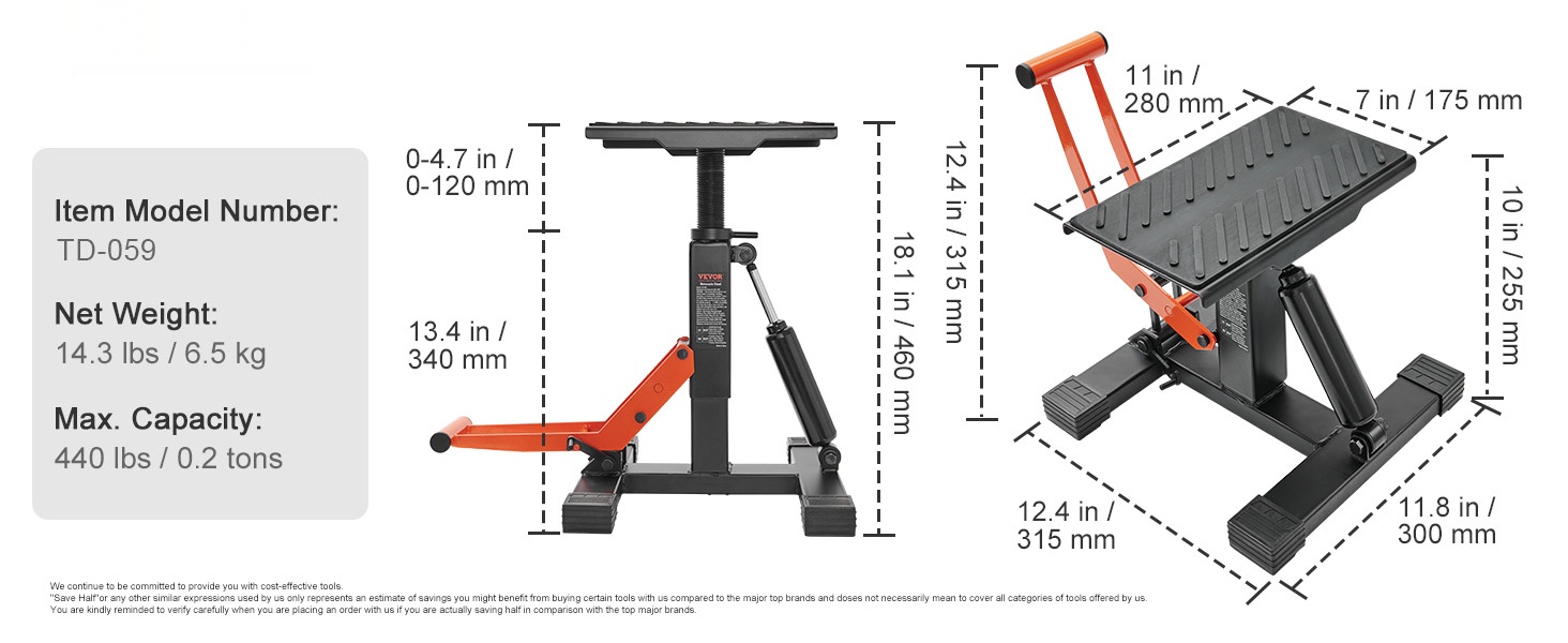 Ammattilaatuinen etu- ja takateline nostaa sekä etu- että takapyörän pystyyn, säädettävä teräsrakenne, 850 lbs kantavuus, neljä pyörää helpottavat liikuttamista, sopii useimmille Yamaha, Honda, Kawasaki ja Suzuki -malleille kotihuoltoon ja säilytykseen.