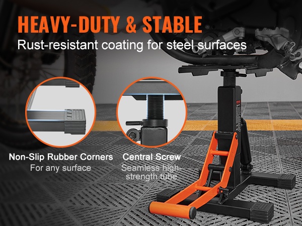 Raskaan käytön moottoripyöräteline auttaa pitämään pyörän vakaana ja pystyssä. Yhdistetty etu- ja takateline sopii hyvin kotona tehtäviin huoltoihin, renkaiden vaihtoon ja pitkäaikaiseen säilytykseen.