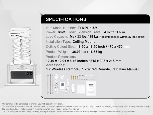 – Laaja yhteensopivuus eri projektorimallien kanssa (kantavuus max 33 lbs / 15 kg, suositus enintään 22 lbs / 10 kg)