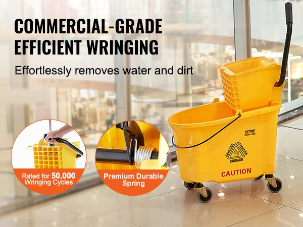 Moppiämpäri 26 QT sivupuristuslinkolla polypropeeninen linko pyörillä ammatti- ja teollisuuskäyttöön keltainen