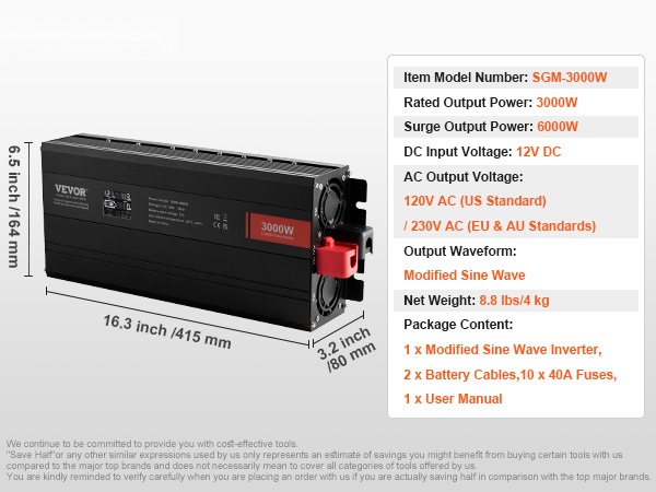 Mukana tulee 1.6 FT/0.5 M puhdas kuparinen liitäntäkaapeli, joka mahdollistaa joustavan sijoittelun ja tehokkaan energiansiirron akulta vaihtosuuntaajalle. Näin voit asentaa laitteen sinne, missä se on käytännöllisintä.