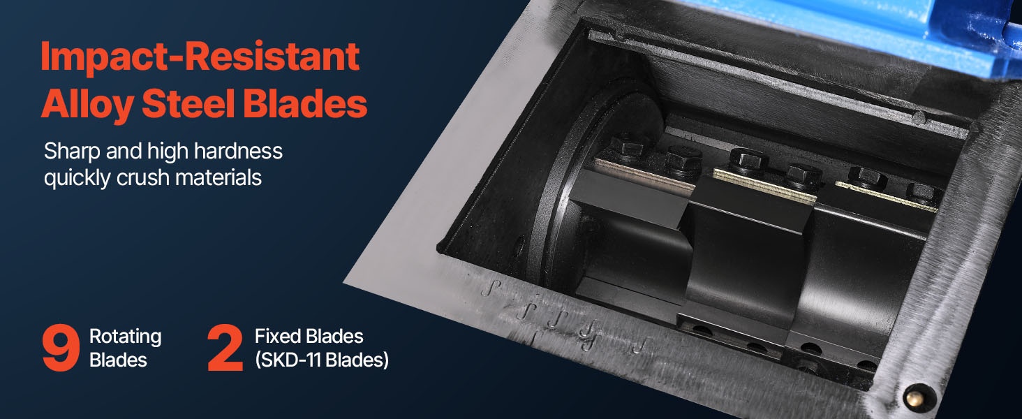 Muovimurskaimessa on 11 kpl SKD-11 -teriä (9 pyörivää + 2 kiinteää), jotka on valmistettu iskunkestävästä seosteräksestä. Terät ovat teräviä ja kovia, joten ne murskaavat tehokkaasti erilaisia materiaaleja. Terät voidaan teroittaa tai vaihtaa, mikä pidentää käyttöikää ja vähentää huoltokustannuksia.