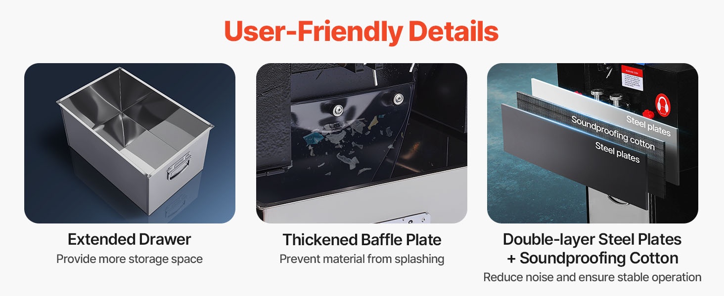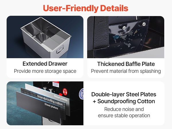 Laajennettu laatikko tarjoaa lisäsäilytystilaa, ja paksunnettu välilevy estää tehokkaasti materiaalin roiskumista. Kaksikerroksiset teräslevyt yhdessä äänieristysvillan kanssa auttavat vähentämään melua ja parantamaan käyttömukavuutta.