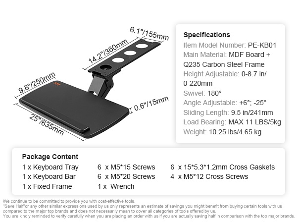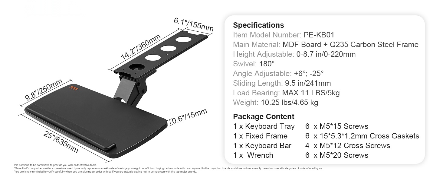- Näppäimistötaso: 9.8 x 25 tuumaa / 250 x 635 mm – sopii useimmille vakiokokoisille näppäimistöille ja hiirille