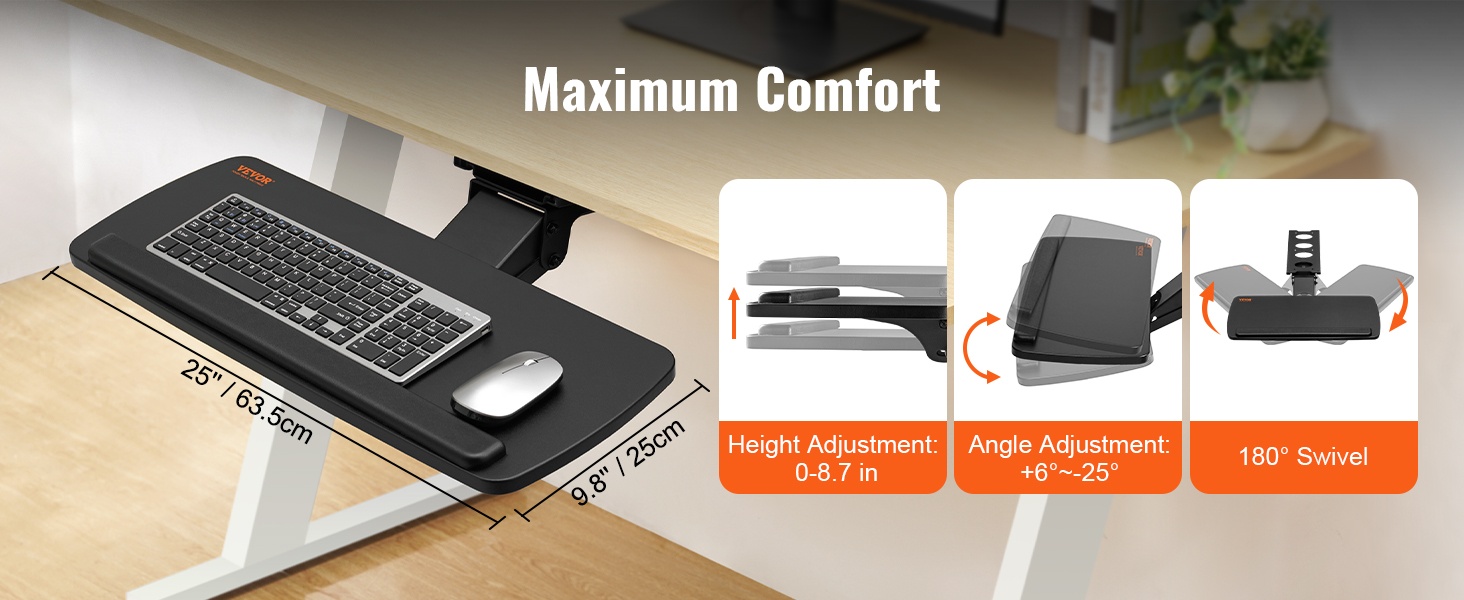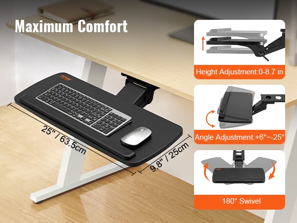 25 x 9.8 tuuman taso tarjoaa tilaa useimmille vakiokokoisille näppäimistöille ja hiirille. Korkeutta voi säätää 7.5 tuumaa, vaakasuuntainen kääntö on 180° ja pystykallistus 38°, joten löydät helposti itsellesi sopivan ja luonnollisen kirjoitusasennon.