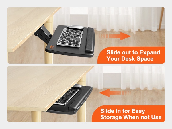 Liukukiskot mahdollistavat tasolle helpon pääsyn – vedät tason nopeasti esiin pöydän alta ja työnnät sen käytön jälkeen takaisin, jolloin se ei ole tiellä, kun et kirjoita.