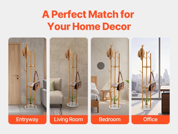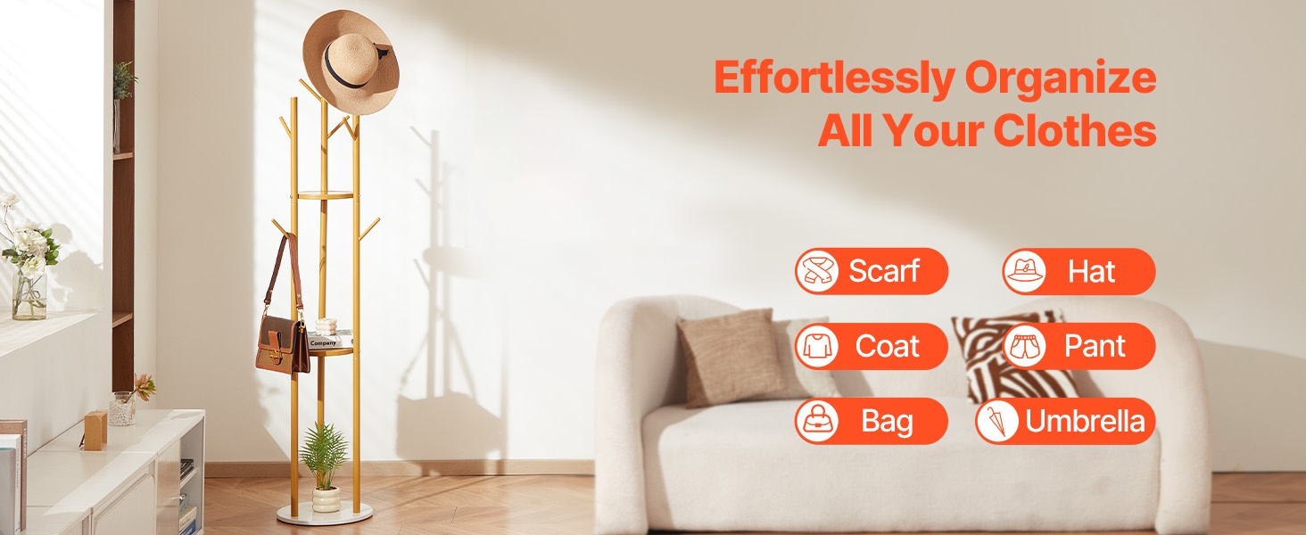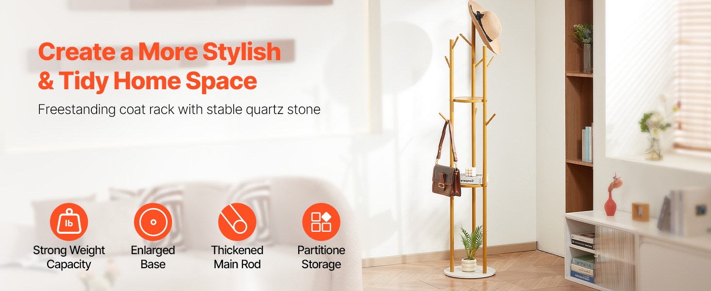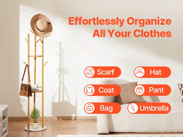 Pidä takit, hatut, huivit ja laukut siististi järjestyksessä tämän vapaasti seisovan naulakon avulla. Tyylikäs metallinen naulakko sisältää tukevan marmorijalustan, 14 porrastettua koukkua, erillisen sateenvarjotelineen sekä vahvistetun hiiliteräksisen rungon. Se sopii hyvin eteiseen, makuuhuoneeseen, olohuoneeseen tai työtilaan.