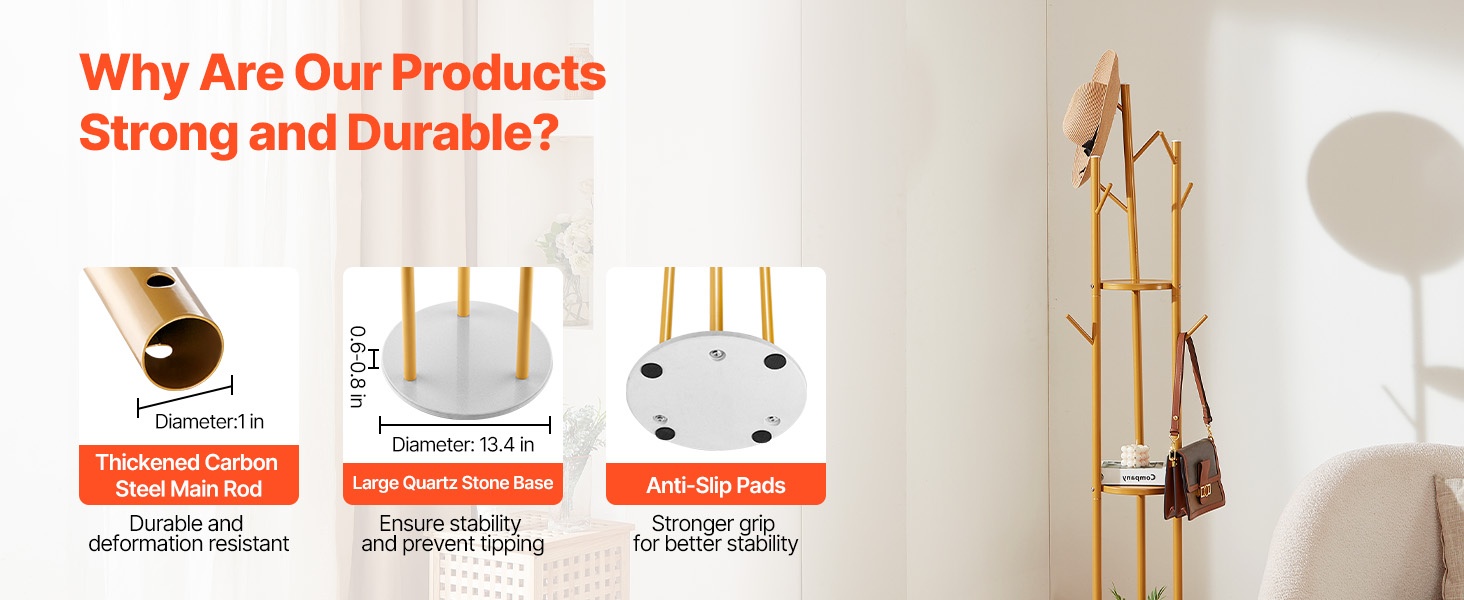 Naulakon hyvä vakaus ja kestävyys perustuvat paksuun hiiliteräsrunkoon, kaatumista estävään marmorijalustaan sekä liukuestepehmusteisiin jalustan alla. Ne auttavat pitämään takit, laukut ja hatut tukevasti paikallaan ja tekevät naulakosta käytännöllisen osan kodin säilytysratkaisuja.