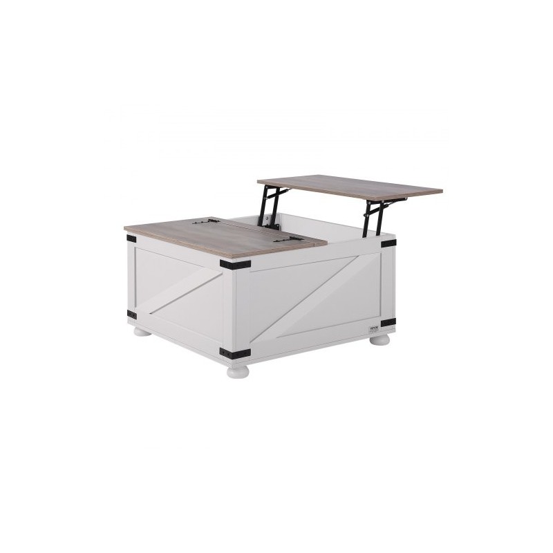 Neliönmuotoinen, nostokannella varustettu sohvapöytä tarjoaa kätevän työ- ja oleskelutason sekä piilotetun säilytystilan. Harmaan ja valkoisen sävyt sekä puinen ilme tuovat kotiin rauhallista, maalaismaista tunnelmaa.
