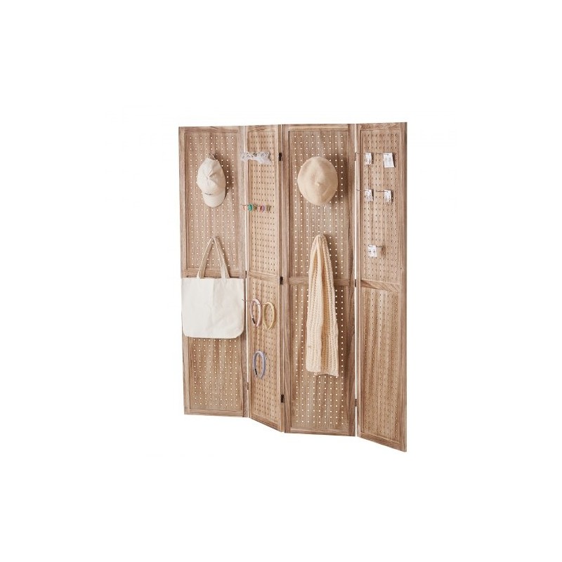 Jokaisessa paneelissa on rei’itetty pegboard-pinta, johon voi ripustaa esimerkiksi hattuja, huiveja ja pieniä tarvikkeita sopivilla koukuilla. Paneelit kääntyvät 360° kaksoissuuntaisten saranoiden varassa, joten voit muotoilla tilanjakajan helposti eri kulmiin ja taittaa sen kasaan säilytystä tai siirtämistä varten.