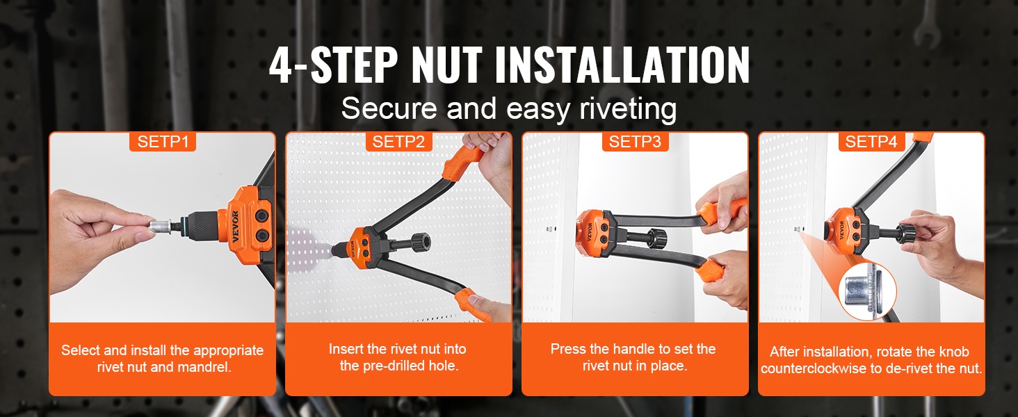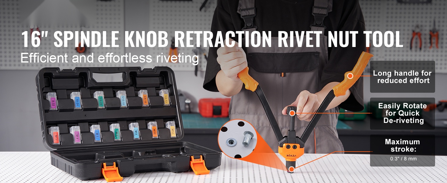 16-tuumainen puolautomaattinen niittimutterityökalu helpottaa niittien vapauttamista: riittää, että kierrätät säädintä, jolloin niitti irtoaa automaattisesti. Pitkä kahvarakenne antaa hyvän vipuvoiman, joten työ sujuu kevyemmin ja nopeammin – vähemmän rasitusta, enemmän tuloksia.