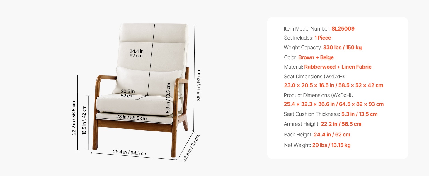 - Käsinojan korkeus: 22.4 in / 57 cm