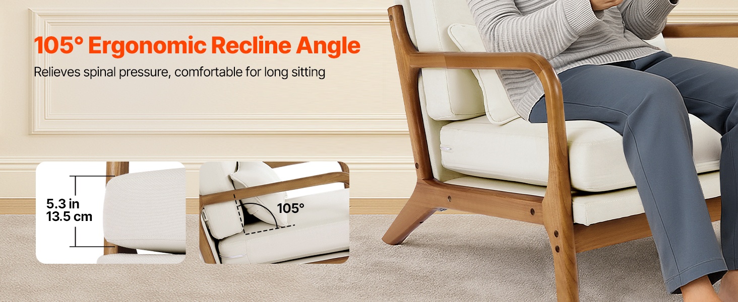 Tuolissa on noin 105° selkänojan kallistuskulma, joka tukee selkärankaa luonnollisesti. Tiheä ja kimmoisa vaahtopehmuste myötäilee kehoa ja tarjoaa miellyttävän istuma-asennon rentoutumiseen tai lukemiseen.