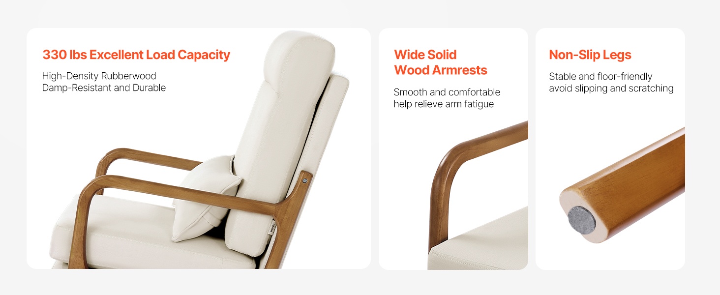 Tuoli on valmistettu paksusta massiivipuusta ja kestää jopa 330 lbs / 150 kg kuorman. Sileä, tikuton pinta tuntuu miellyttävältä, ja ergonomisesti muotoillut käsinojat tukevat käsivarsia työn tai lepohetken aikana. Jalkojen alla olevat lattiasuojat parantavat tukevuutta ja suojaavat lattiaa naarmuilta.