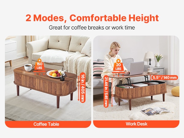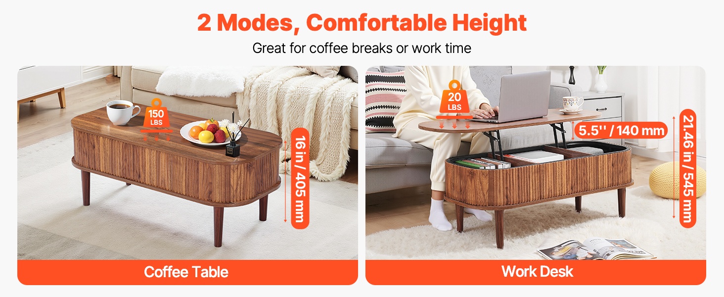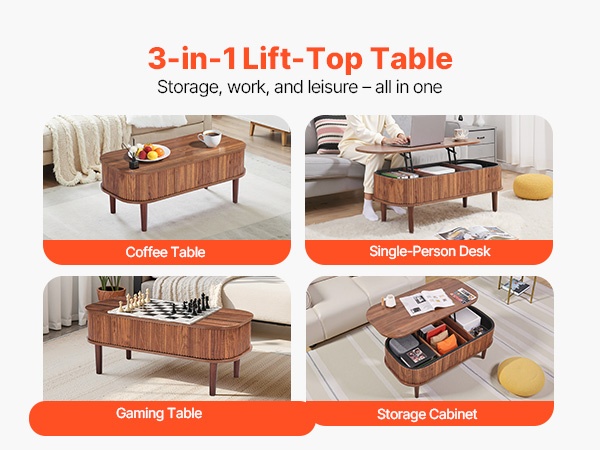 Pöydän käyttö on helppo sovittaa tilanteen mukaan – rentoon oleiluun, työntekoon tai tavaroiden säilytykseen. Sitä voi käyttää tavallisena sohvapöytänä ja kaappina tai nostaa kannen ja saada tilavan, kahdelle henkilölle sopivan työskentelytason olohuoneeseen tai kotitoimistoon.