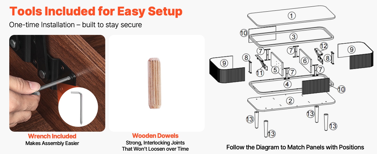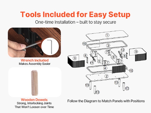 Pakkaukseen sisältyvät kaikki tarvittavat kiinnikkeet vaivatonta kokoamista varten. Mukana tulee myös kätevä jakoavain ja puutapit, joiden avulla saat rakenteesta tukevan ja pitkäikäisen jo ensimmäisellä asennuskerralla.