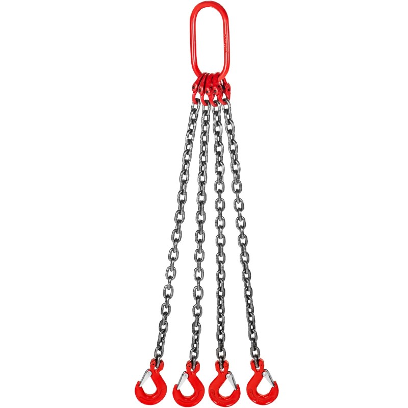 Tämä G80-luokan nelijalkainen nostoketju on valmistettu kestävästä seosteräksestä raskaiden kuormien turvalliseen nosto- ja siirtotyöhön. Ketjuissa on jousisalvoilla varustetut koukut, jotka pitävät kuorman tukevasti kiinni esimerkiksi moottoreita, teräspalkkeja tai muita suurikokoisia kappaleita käsiteltäessä.