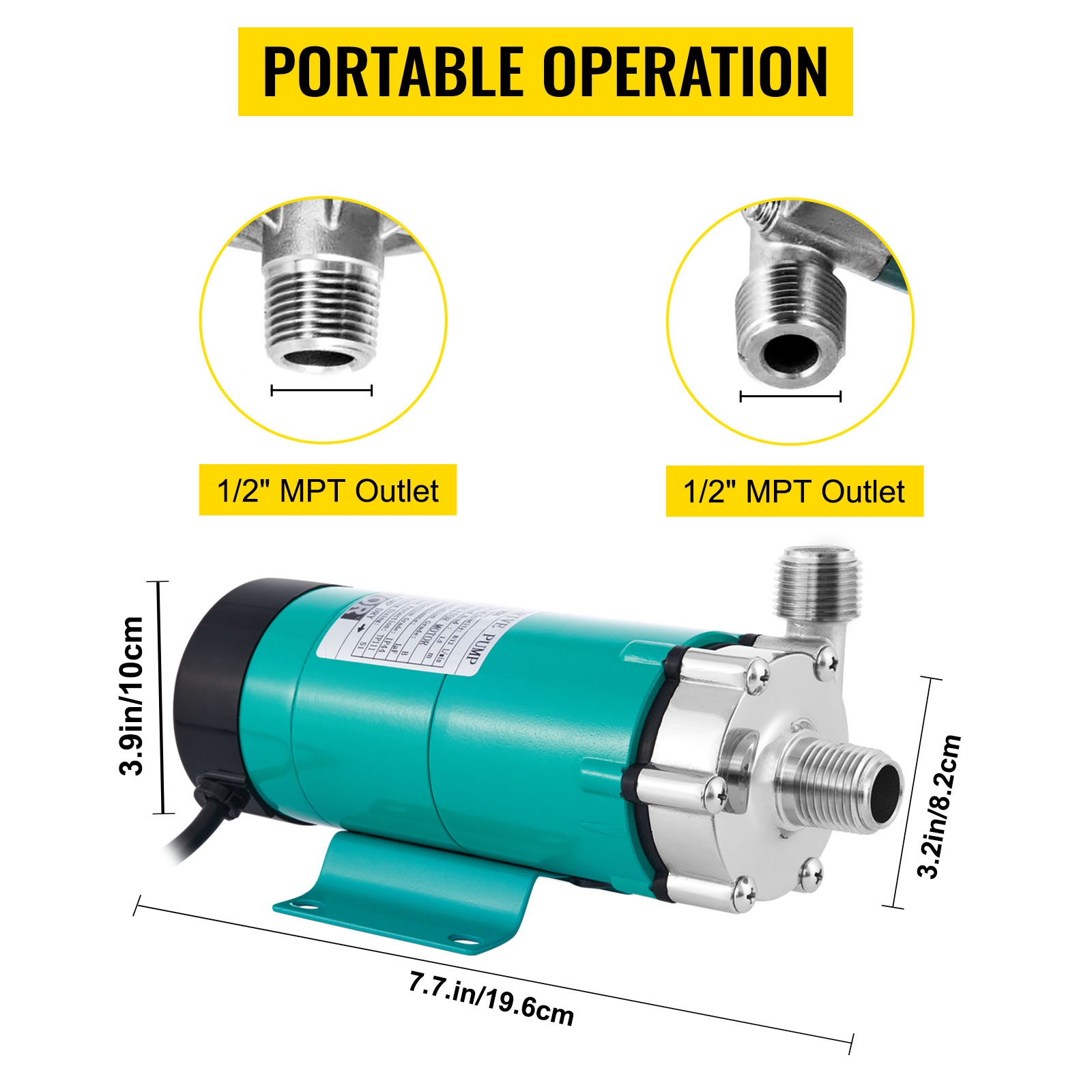 Tulossa ja lähdössä olevat 1/2" MPT-kierteet sopivat useimpiin letkuihin. Pienen kokonsa ansiosta pumppua on helppo käsitellä ilman, että raskaita keittokattiloita tarvitsee siirrellä.