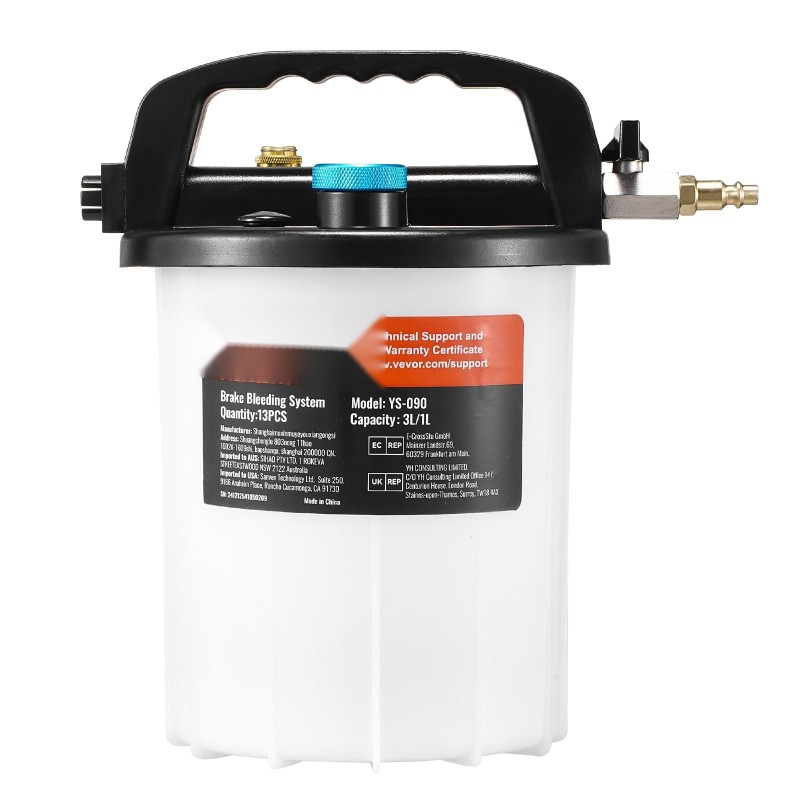 Tämä paineilmakäyttöinen jarrunesteen vaihtosarja helpottaa ja nopeuttaa jarrunesteen vaihtoa. Pakkaus sisältää 3L jarrunesteen imulaitteen, 1L täyttöpullon, 2 pidennettyä letkua ja 13 letkuliitintä, joten se sopii useimpiin ajoneuvoihin, kuten henkilöautoihin, kevyisiin pakettiautoihin ja moottoripyöriin. Yhden henkilön on helppo suorittaa jarrunesteen vaihto muutamassa minuutissa.