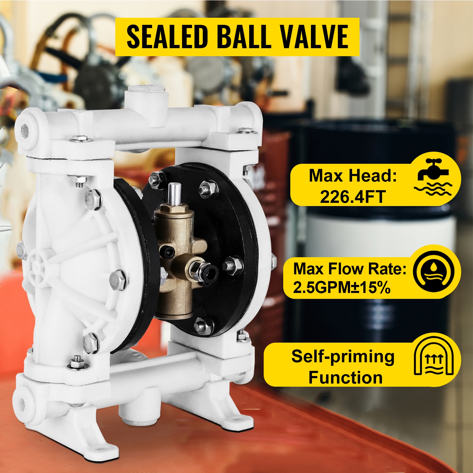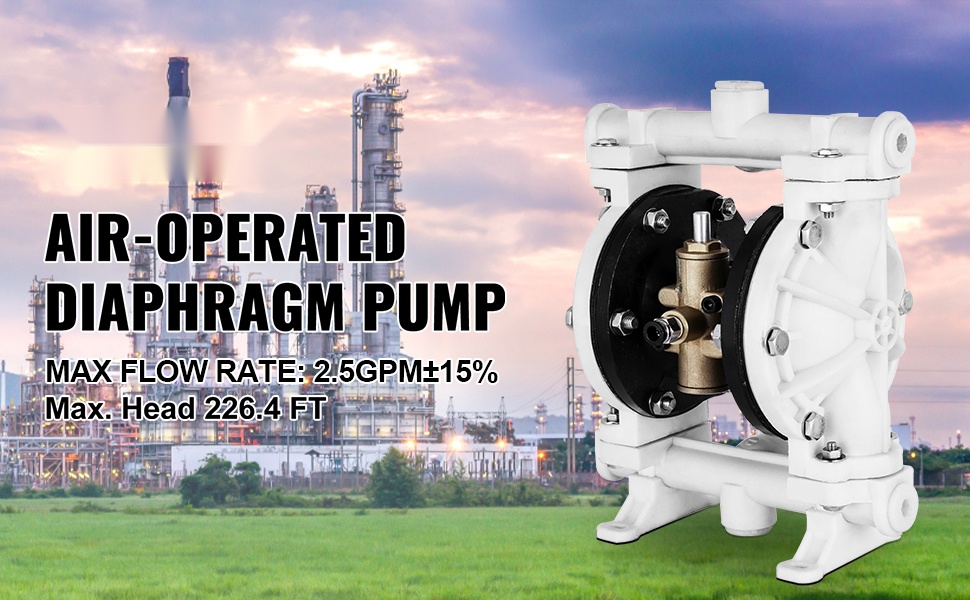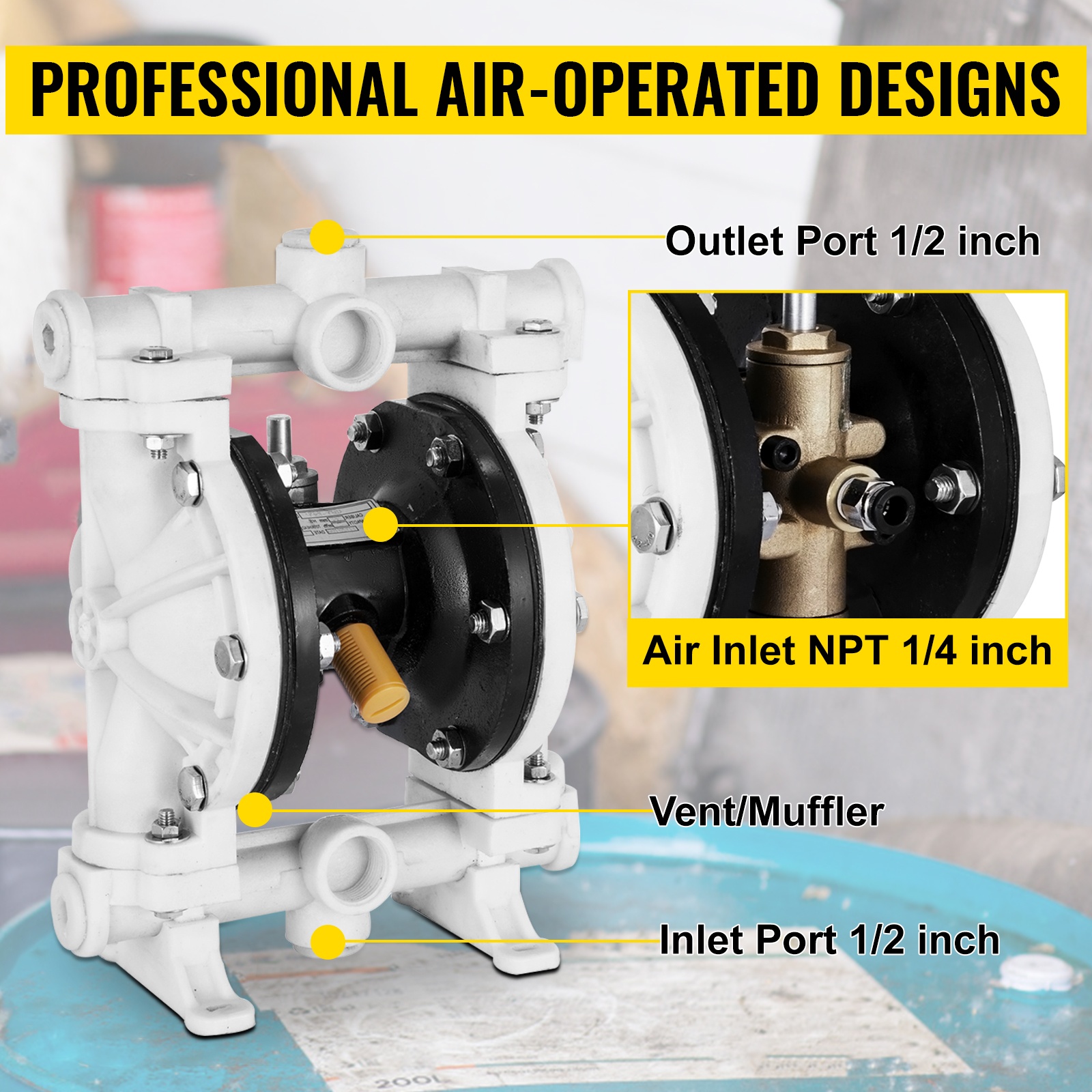 Pumpussa on kaksoiset PTFE-kalvot, joilla on hyvä kemiallinen kestävyys ja pitkä käyttöikä. Maksimi virtausnopeus: 79.6 GPM; maksiminostokorkeus: 275.6 jalkaa / 84 m.