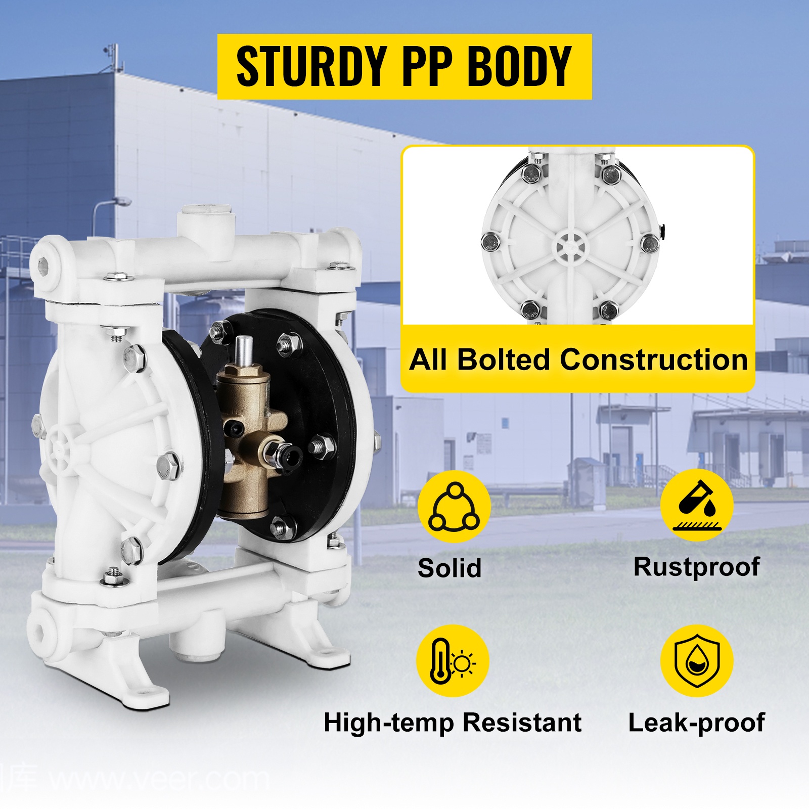 Tämä itseimevä kaksoiskalvopumppu on valmistettu pultatusta polypropeenirungosta ja PTFE-kaksoiskalvoista. Rakenne on tukeva, korroosionkestävä ja vuotamaton. Suljetut palloventtiilit ja ei-jumiutuva toiminta tukevat luotettavaa käyttöä vaativissa prosesseissa. Soveltuu viskoosien ja syttyvien nesteiden siirtoon useissa eri teollisuussovelluksissa.