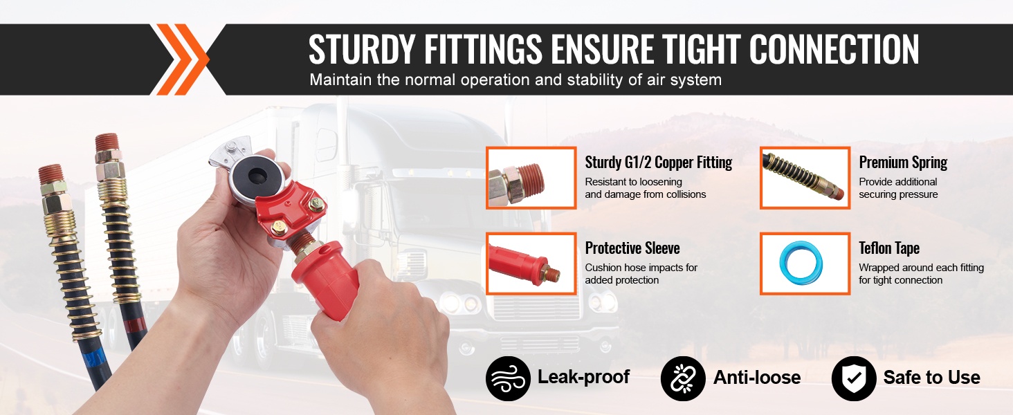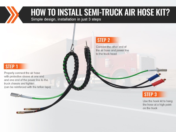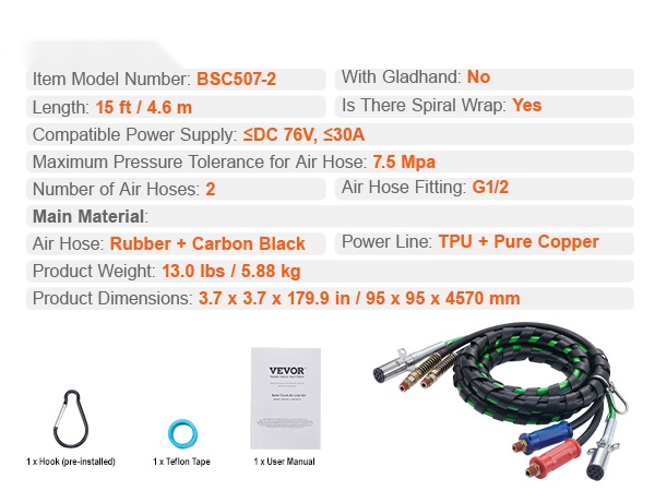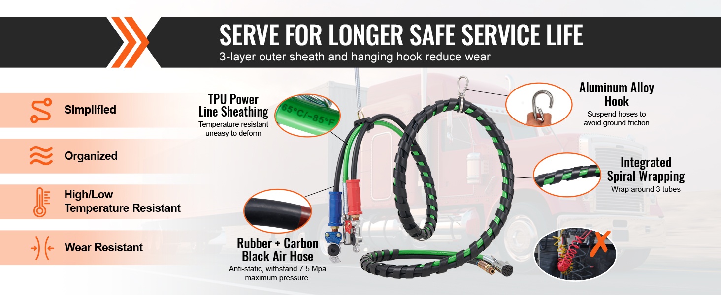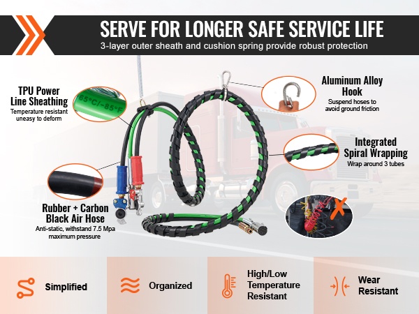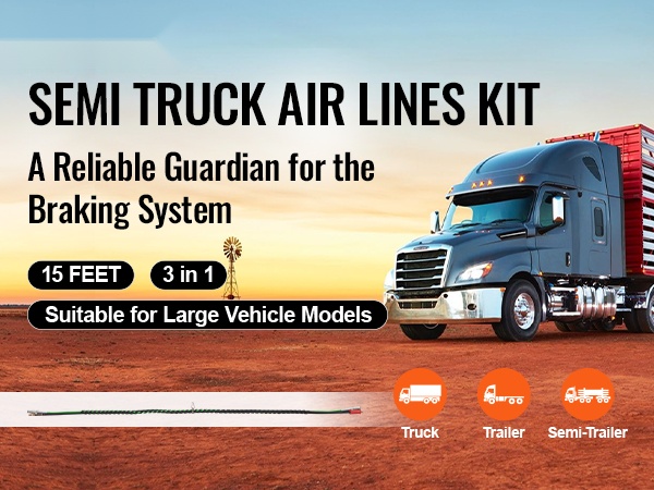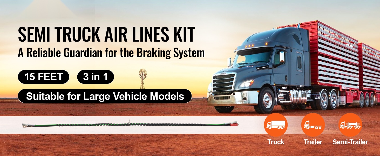 15FT 3-in-1 paineilmaletkusarja kuorma-autolle helpottaa perävaunun ilman- ja sähköjärjestelmän ylläpitoa. Sarja sopii kuluneiden ABS-järjestelmän ilma- ja virtalinjojen vaihtoon ja tarjoaa selkeän, siistin letkuvedon vetoauton ja perävaunun välille.