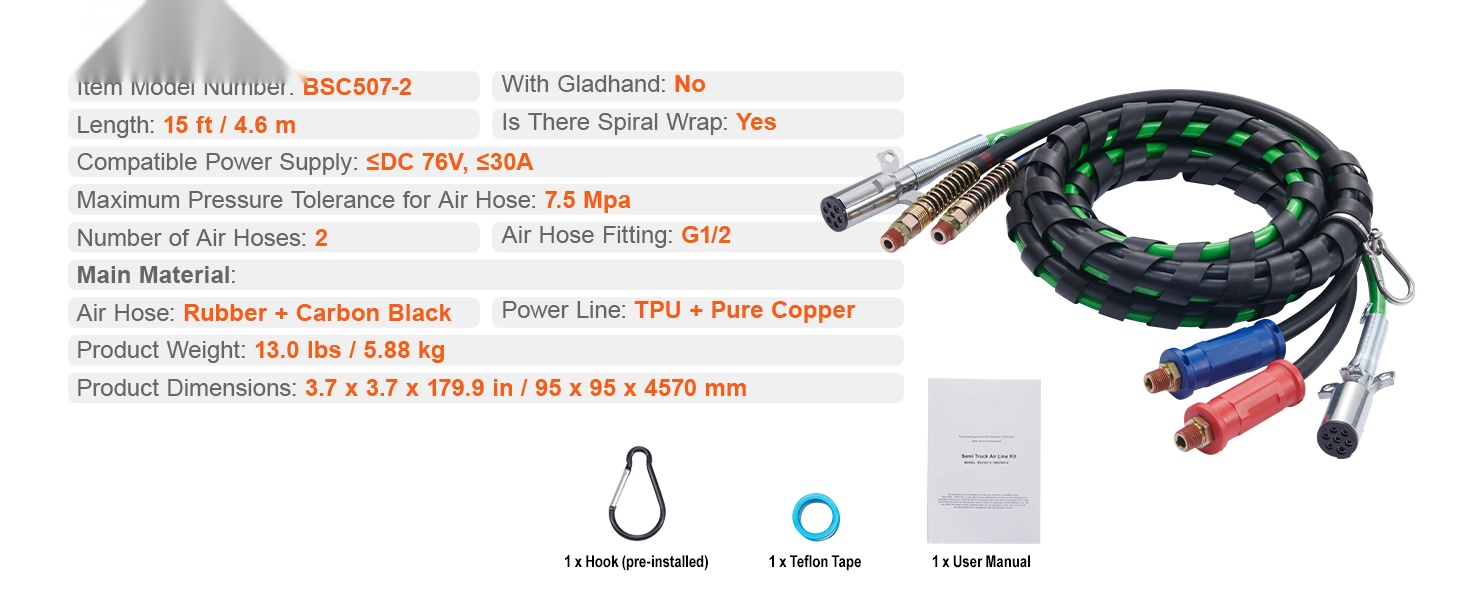 15FT paineilmaletkusarjaan kuuluu 2 kumista ja nokimustasta valmistettua paineilmaletkua sekä TPU-suojakuorella varustettu virtajohto. Materiaalit kestävät hyvin lämpöä, halkeilua ja mekaanista kulutusta. Alumiiniseoksesta valmistettu koukku auttaa pitämään letkut ylempänä ja vähentää maata vasten tapahtuvaa hankausta.
