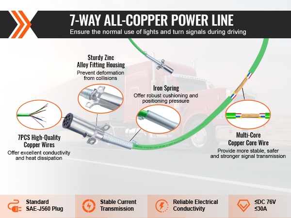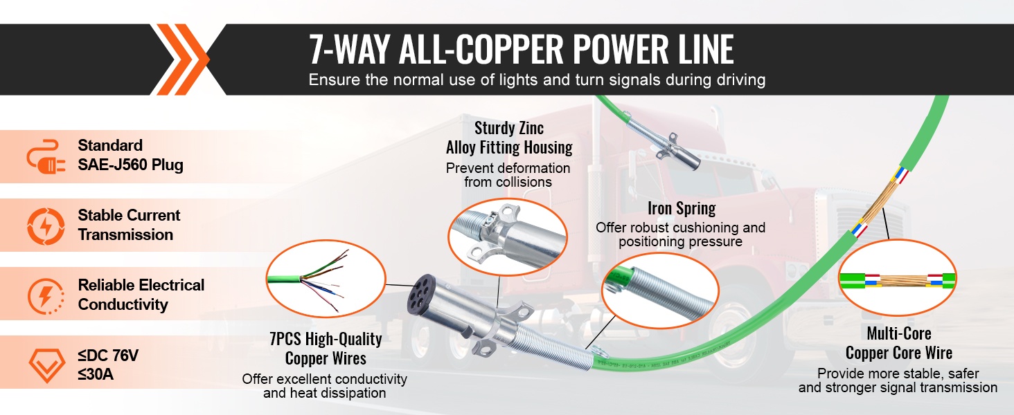 - 7-napainen puhtaasta kuparista valmistettu virtajohto varmistaa valojen ja sähkölaitteiden luotettavan toiminnan.