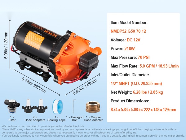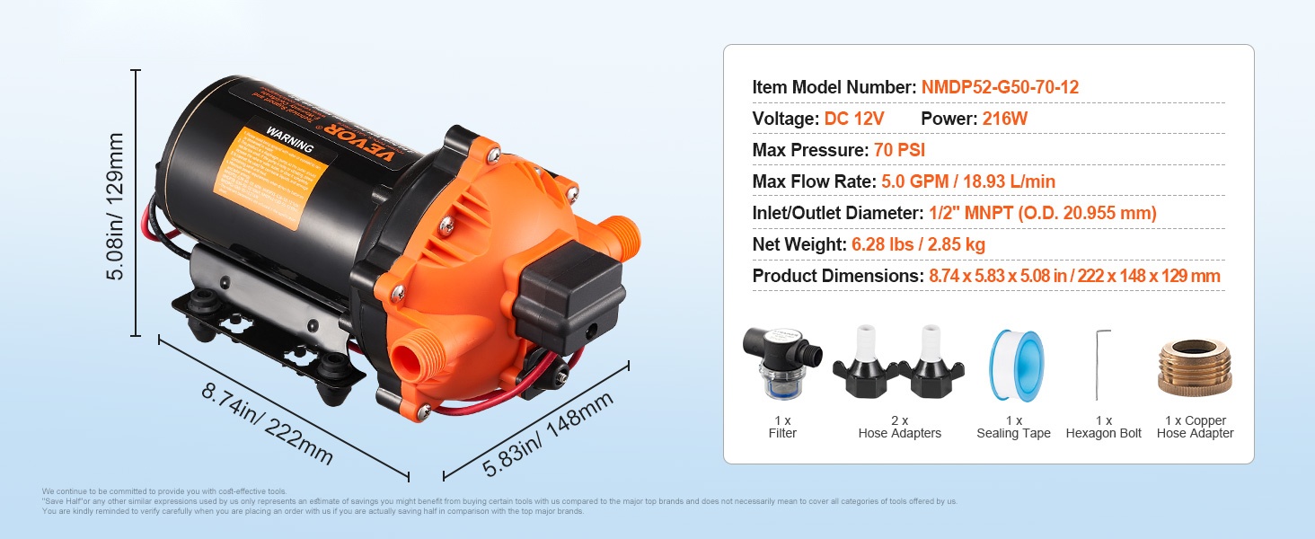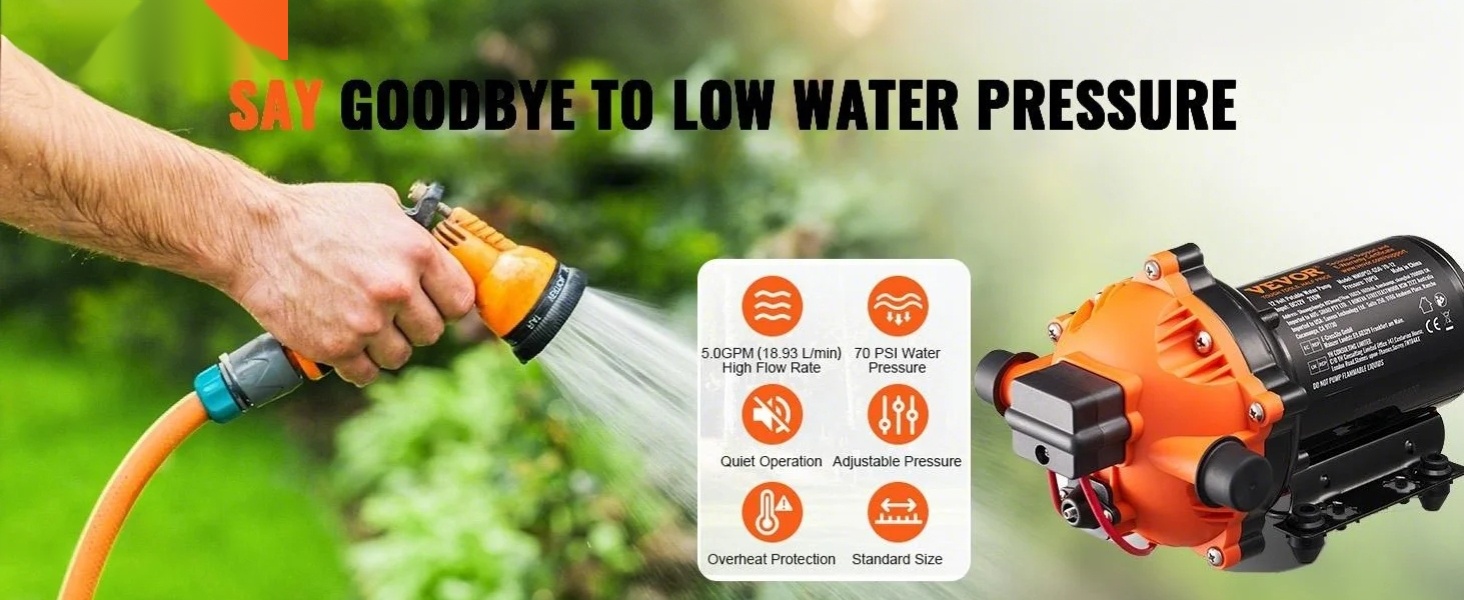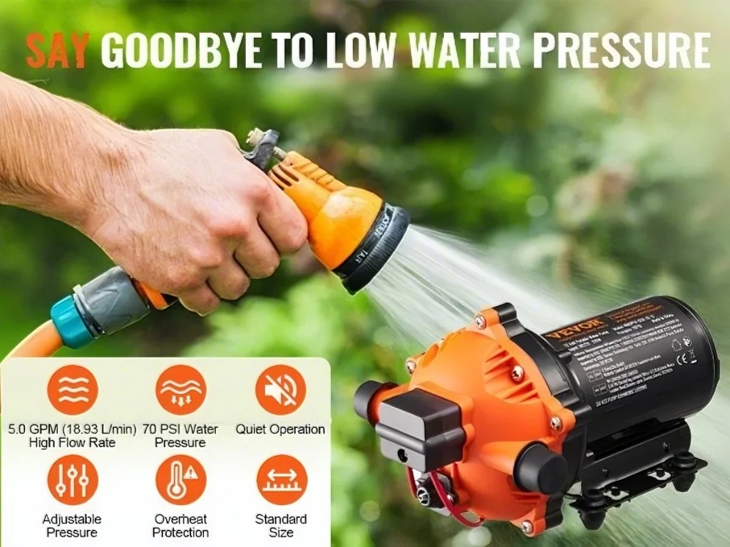 Tämä 12V painekalvopumppu tuottaa jopa 5.0 GPM (18.93 L/min) virtaaman ja esiasetetun 70 PSI paineen, mikä varmistaa tehokkaan ja luotettavan vedenkulun. Säädettävä paine 40–100 PSI, puhtaasta kuparista valmistettu moottori ja vakio 1/2" MNPT-liitäntä tekevät pumpusta monipuolisen ratkaisun esimerkiksi maatalouden kasteluun ja työmaiden kuivaukseen.