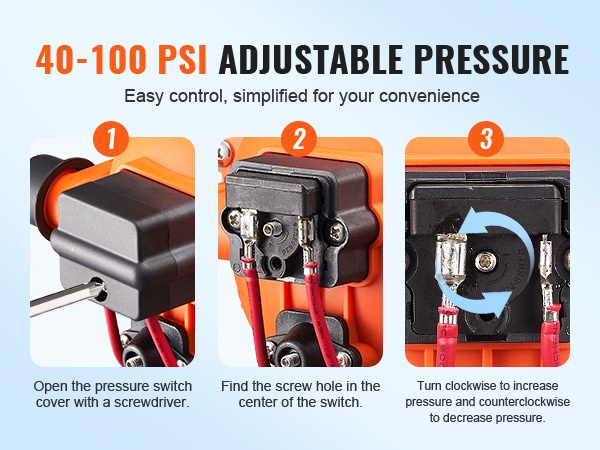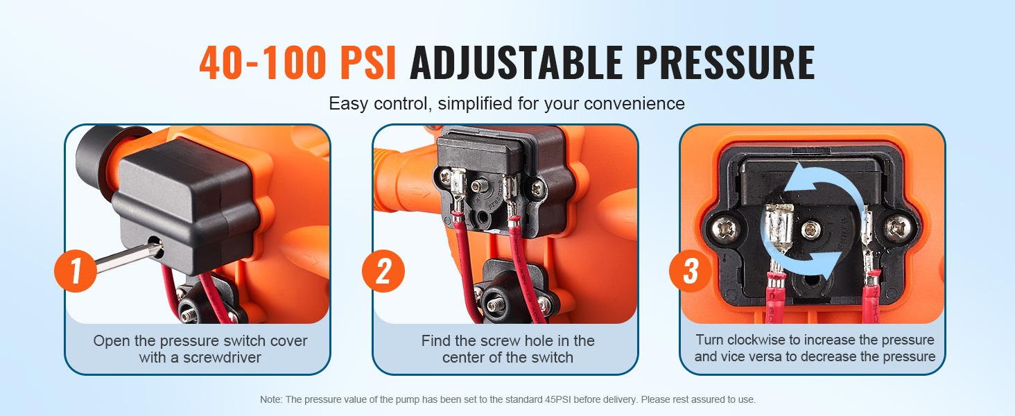 Painetta on helppo säätää tarpeen mukaan. Avaa painekytkin ruuvimeisselillä, etsi keskellä oleva ruuvi ja kierrä sitä myötäpäivään paineen nostamiseksi tai vastapäivään paineen laskemiseksi. Näin voit mukauttaa vedenkulutuksen käyttökohteen mukaan ja välttää turhaa vedenkäyttöä.