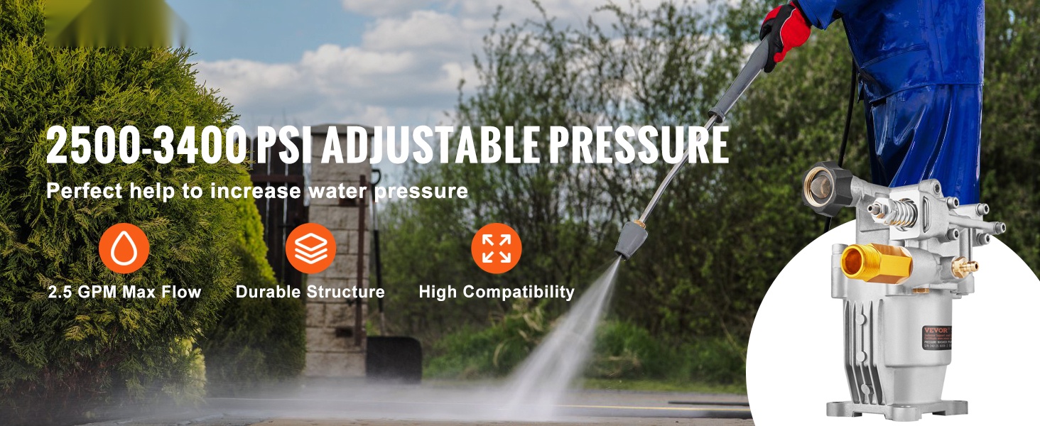 Etsitkö helppoa ratkaisua päivittäisiin ja ammatillisiin puhdistustehtäviin? Tämä vaihtopumppu tarjoaa säädettävän paineen välillä 2500–4400 PSI, joten se sopii hyvin seinien, jalkakäytävien ja ajoneuvojen tehokkaaseen pesuun.