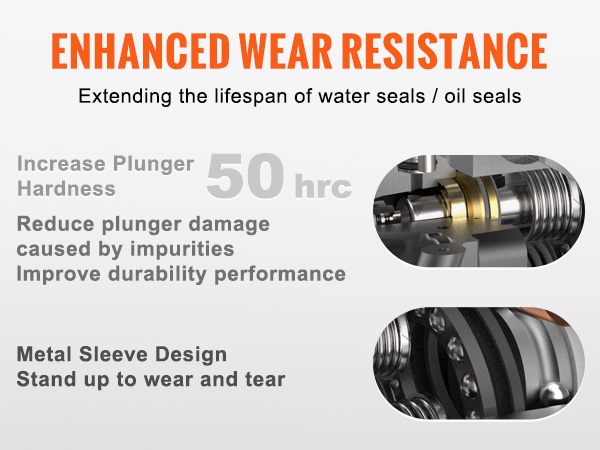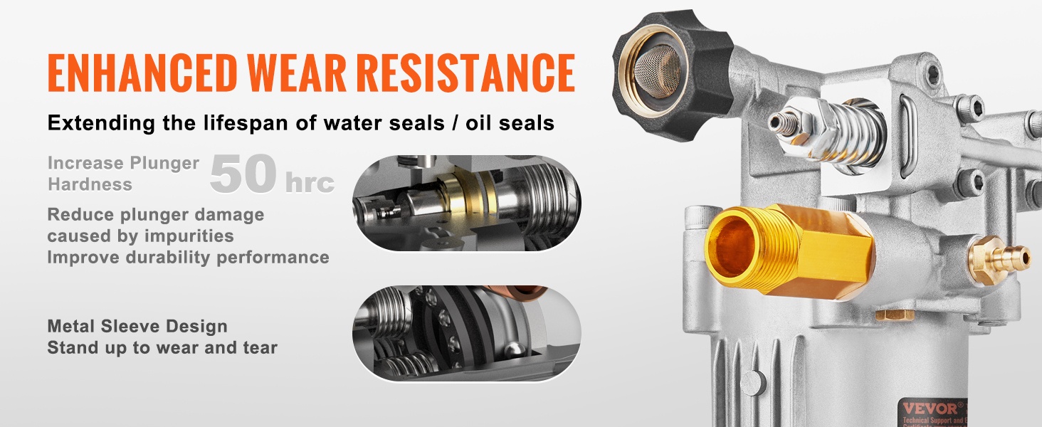 Painepesurin pumppu hyödyntää vahvistettua männän kovuutta, joka vähentää epäpuhtauksien aiheuttamien vaurioiden riskiä. Tämä parantaa kulutuskestävyyttä ja pidentää vesi- ja öljytiivisteiden käyttöikää.