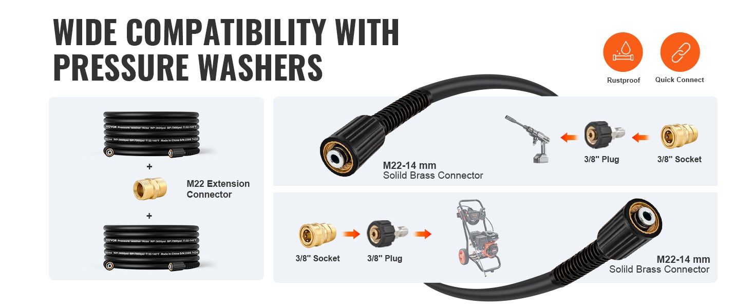 3/8"-φ14.8 uros- ja 3/8"-φ15 naarasliitin tarjoavat tiiviin ja vuotamattoman liitoksen, joka on suunniteltu sopimaan useimpiin vakiomallisiin painepesureihin.