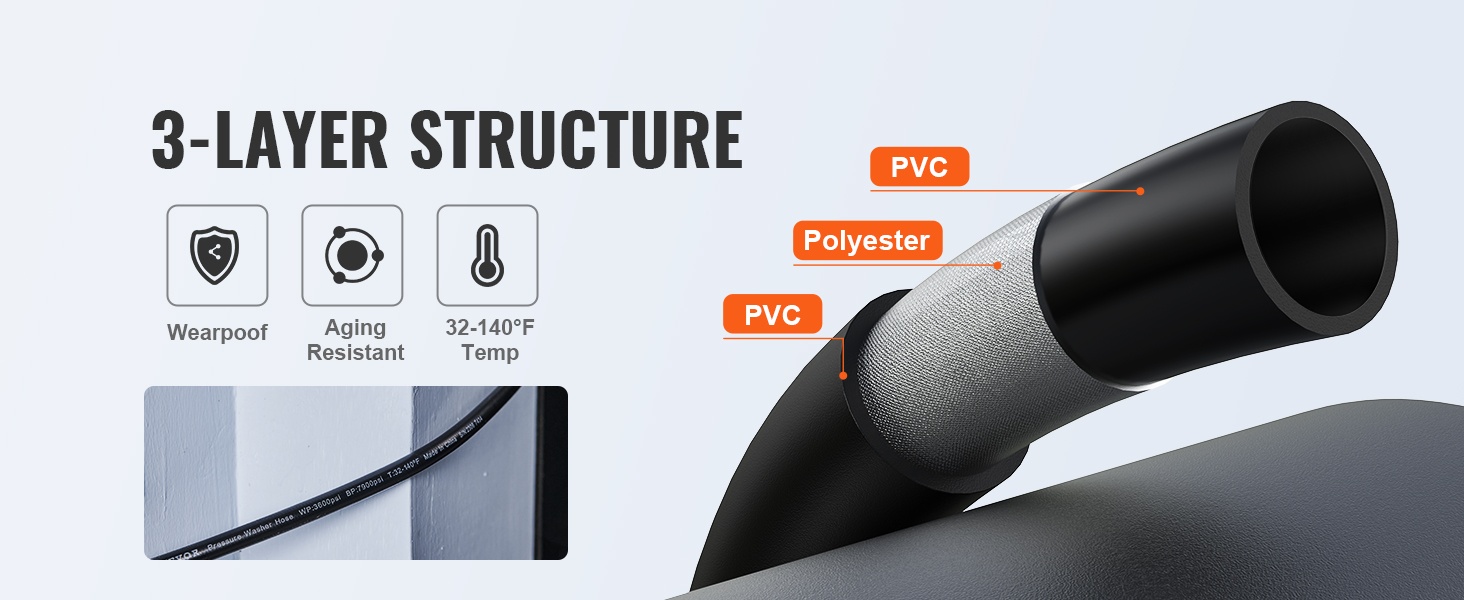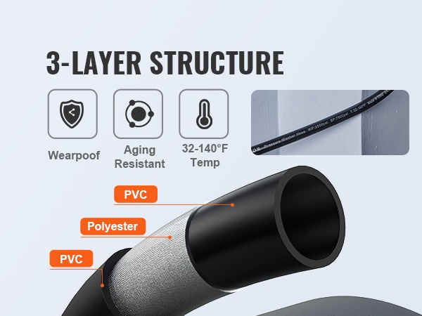 Kolmikerroksinen rakenne parantaa letkun lujuutta ja kestävyyttä. Se on tehty toistuvaan käyttöön ja säilyttää suorituskykynsä pitkään.