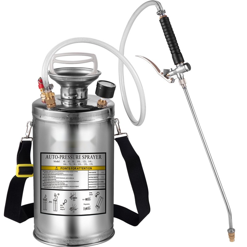 Kestävästä ruostumattomasta teräksestä valmistettu käsikäyttöinen painepullo sopii niin kotiin, puutarhaan kuin erilaisiin siivous- ja desinfiointitehtäviin. Noin 1.5 gallonan (6L) käyttötilavuus riittää hyvin esimerkiksi kasvien kasteluun ja suojaukseen, lattioiden ja pintojen puhdistukseen tai ajoneuvojen pesuun.