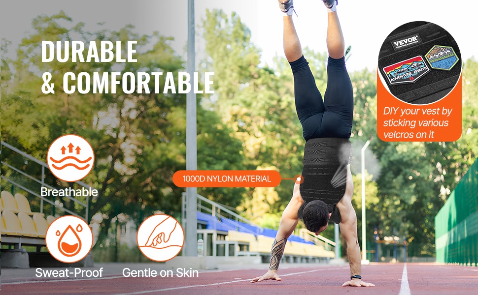 Liivi on valmistettu vahvasta 1000D-nailonista, joka hengittää, hylkii hikeä ja tuntuu miellyttävältä ihoa vasten. Materiaali kestää toistuvaa käyttöä sekä sisä- että ulkotreeneissä.