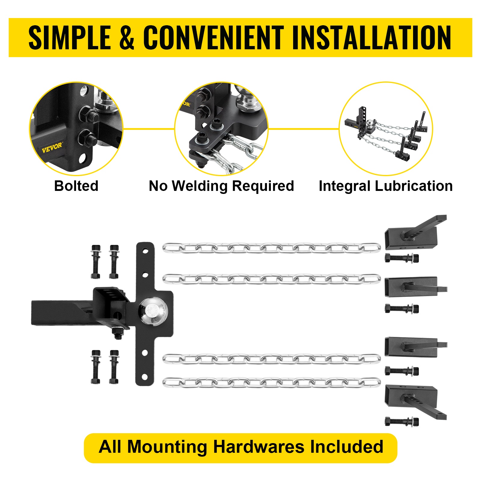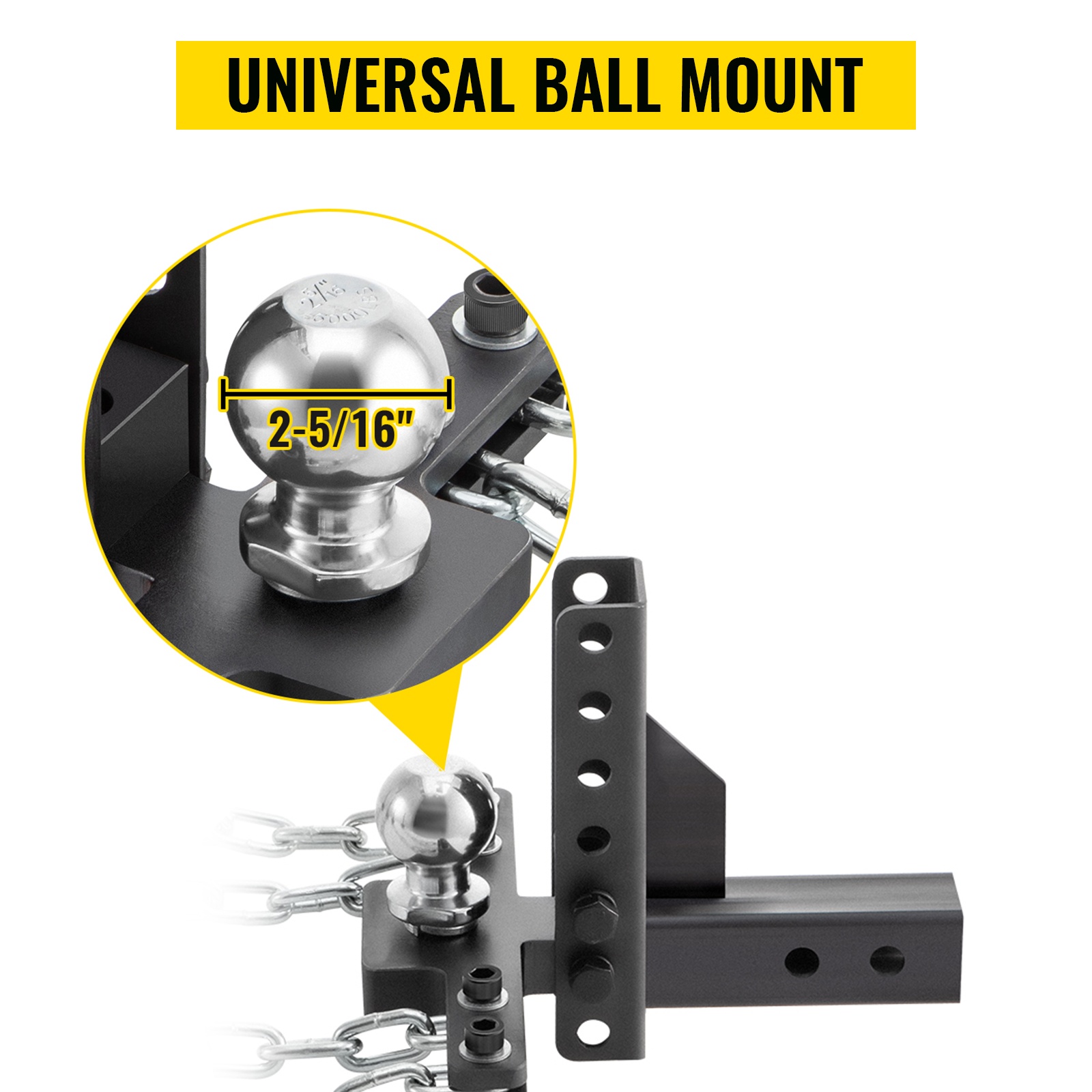 Vakio 2" vetokuula ja heilunnanvaimennusketjut on kiinnitetty säädettävään kuula-adapteriin. Asennuskorkeutta voidaan säätää tarpeen mukaan, ja säätövara on 4" / 10,2 cm.
