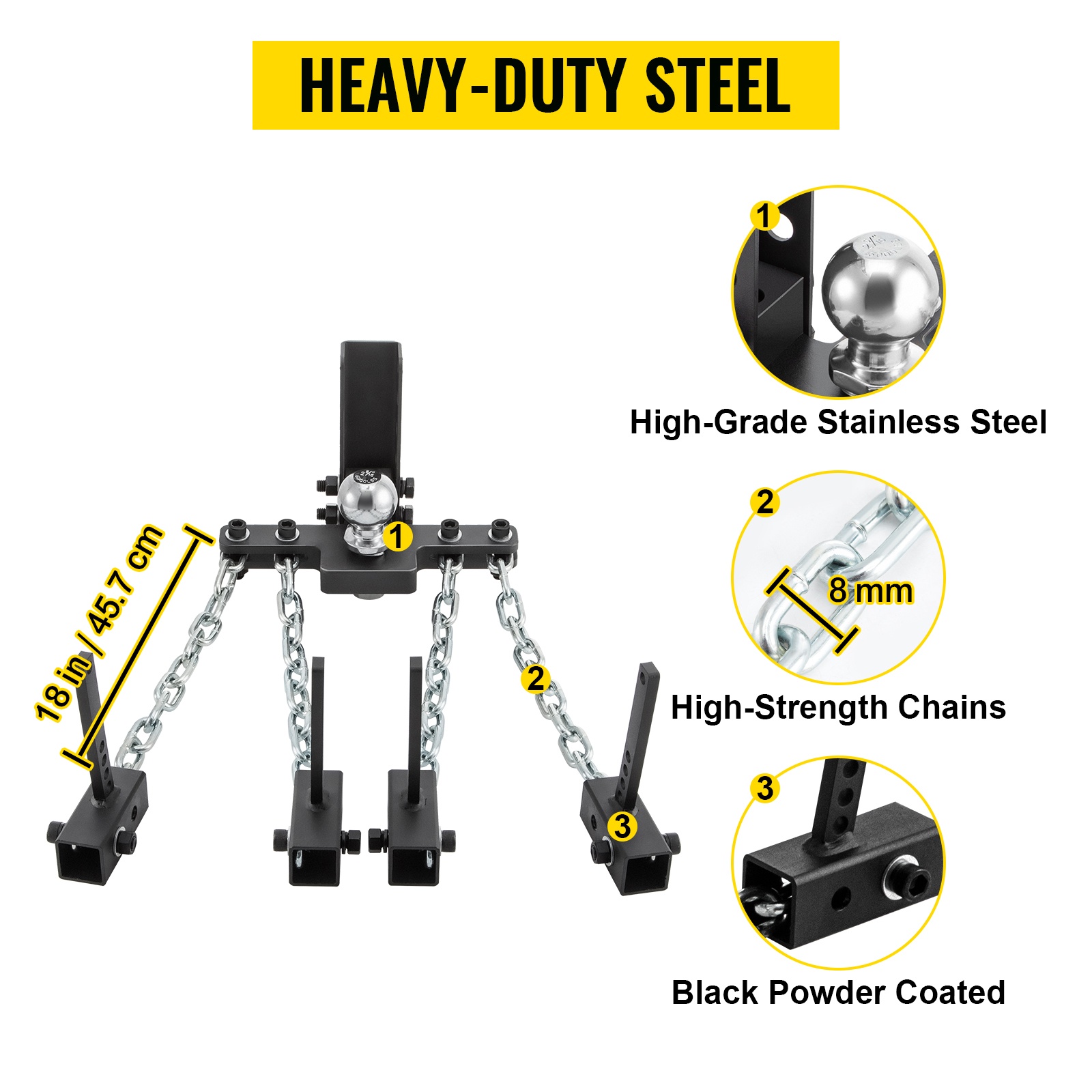 Painonjakajavetokoukku on valmistettu lujasta teräksestä. Täysin teräksinen, jauhemaalattu rakenne kestää hyvin kulutusta ja korroosiota sekä soveltuu vaativiin olosuhteisiin. Ketjun pituus: 18 in / 45,7 cm.