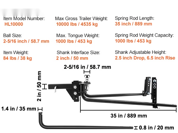 - Maksimi perävaunun kokonaispaino: 10000 lbs / 4535 kg