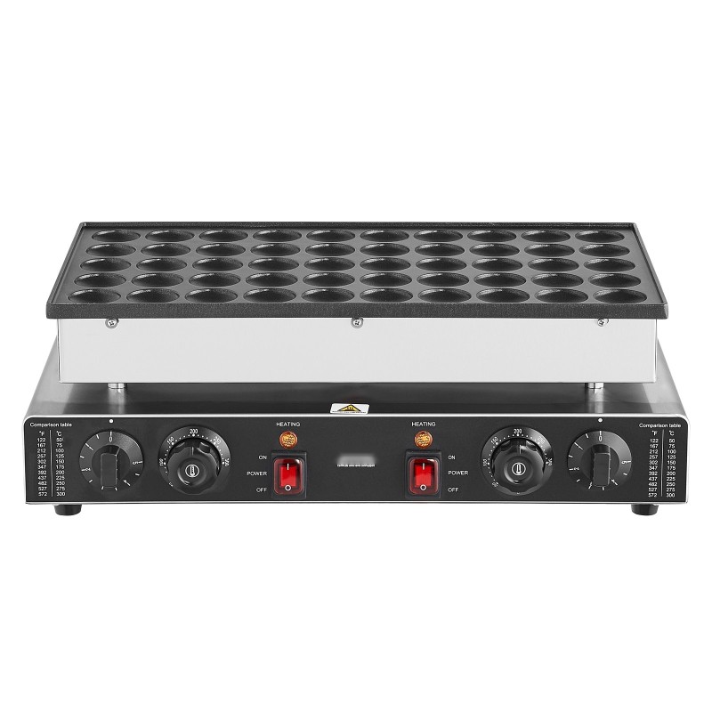 Tämä sähkötoiminen poffertjes- ja dorayaki-paistolevy paistaa kerralla 50 pientä pannukakkua, halkaisija 43mm. Tehokas 1700W vastus ja kaksinkertainen lämpötila- ja ajastinsäätö tekevät laitteesta sopivan sekä kotikeittiöön että ammattikäyttöön ravintoloissa ja kahviloissa. Runko on ruostumatonta terästä ja paistopinta on tarttumaton, mikä helpottaa sekä paistamista että puhdistusta.