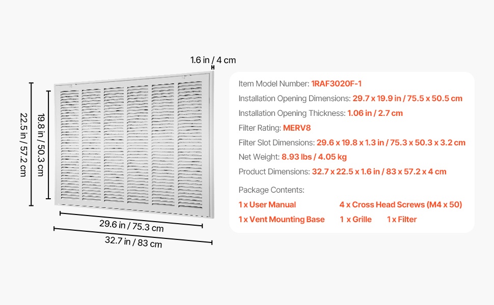 - Suodatinpaikan mitat: 29.6 x 19.8 x 1.3 tuumaa / 75.3 x 50.3 x 3.2 cm