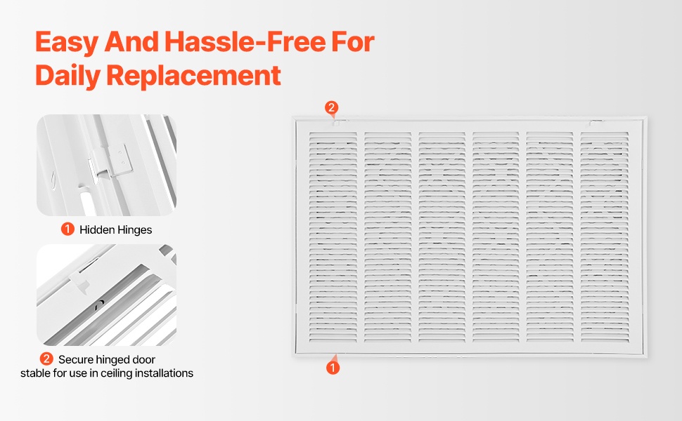 Palautusilmasäleikössä on helposti käytettävä lukitus, jonka ansiosta etupaneeli avautuu ja sulkeutuu vaivattomasti. Tämä helpottaa suodattimen puhdistusta ja vaihtoa. Piilotetut saranat mahdollistavat turvallisen ja siistin asennuksen myös kattoon.