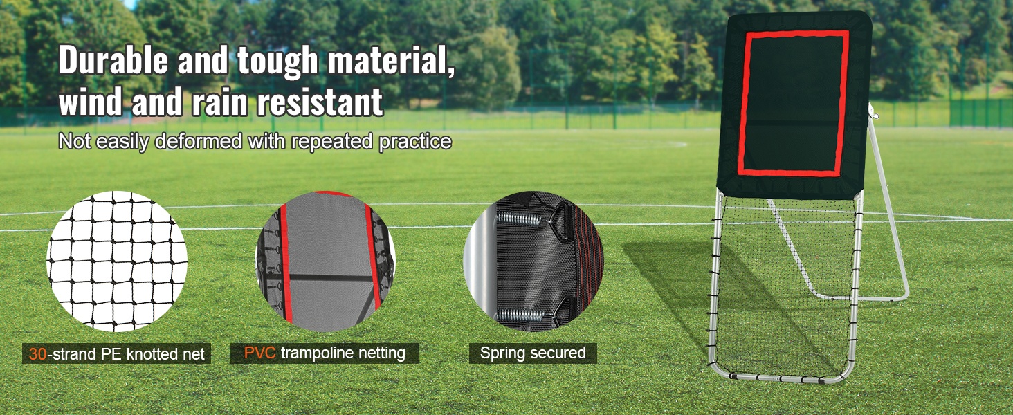 Tiheäsilmäinen PE-verkko yhdistettynä UV-suojaukseen kestää auringonpaistetta, tuulta ja sadetta. PVC-reuna parantaa joustavuutta ja palautusta, joten pallo kimpoaa tasaisesti takaisin harjoittelua varten. Rakenne soveltuu hyvin ulkokäyttöön suurimman osan vuodesta.