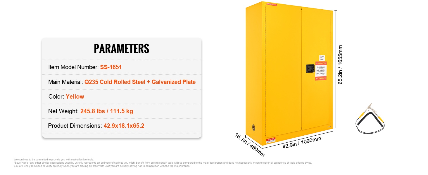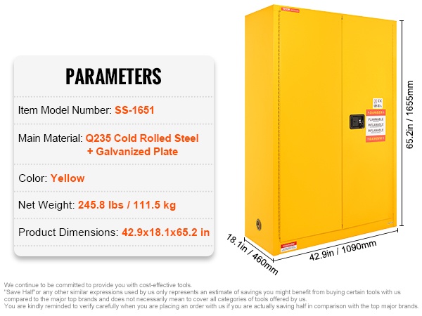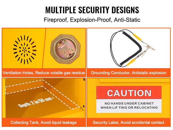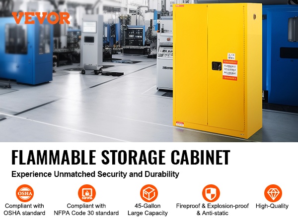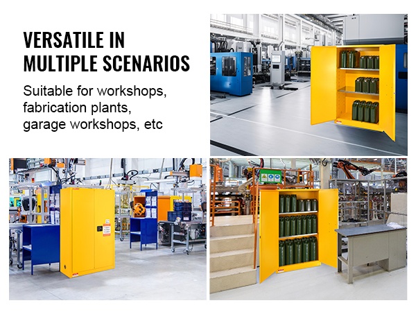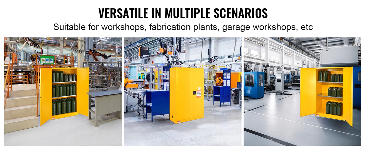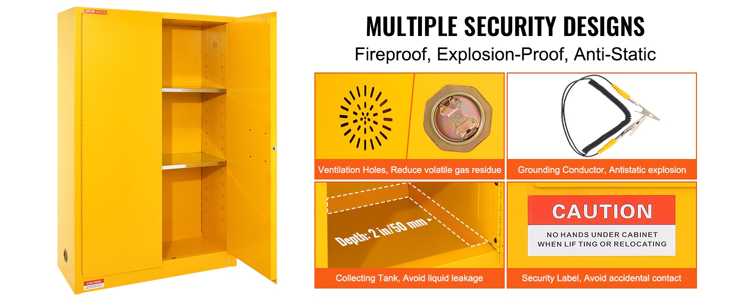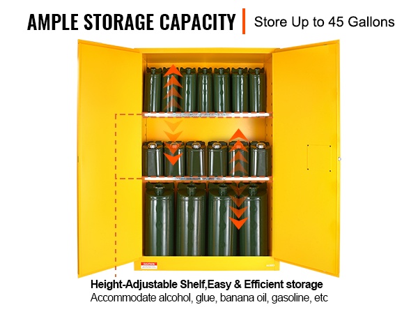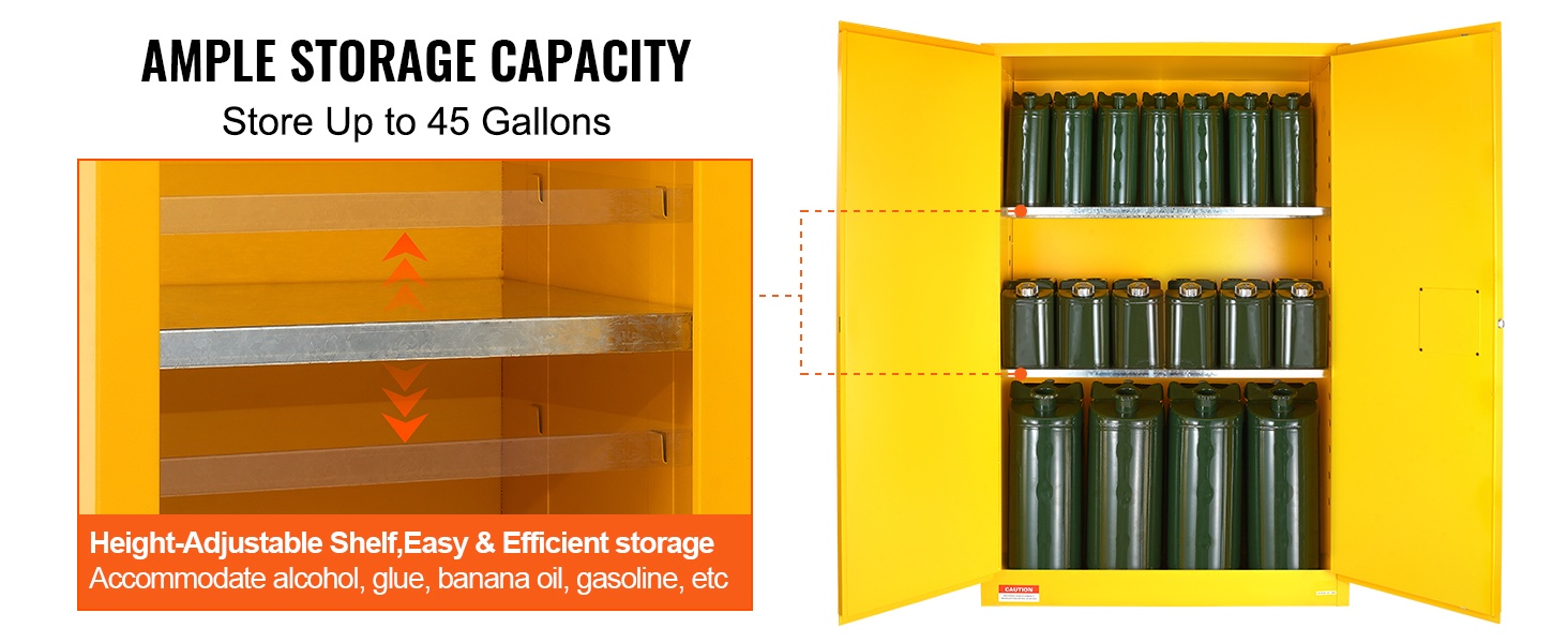 45 gallonan säilytystilavuus mahdollistaa erilaisten palavien ja helposti syttyvien materiaalien, kuten alkoholin, liiman, banaaniöljyn, bensiinin ja muiden vastaavien aineiden turvallisen säilytyksen. Tilaa riittää useille erilaisille astioille ja pakkauksille.