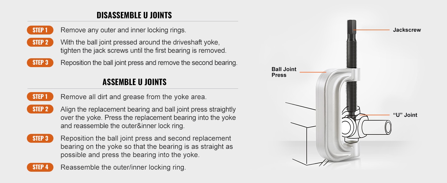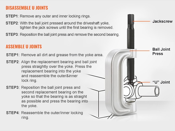 C-muotoinen puristin ja erikokoiset holkit tekevät pallonivelten asentamisesta ja irrottamisesta hallitumpaa ilman tarvetta erikoiskoneille. Työkalut on suunniteltu helpottamaan työtä sekä korjaamoilla että kotikäytössä.