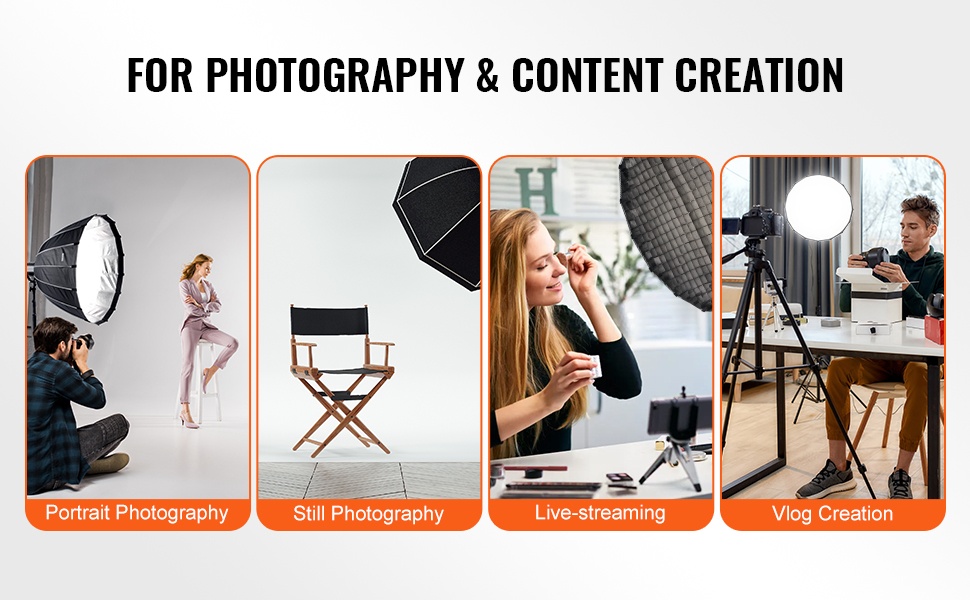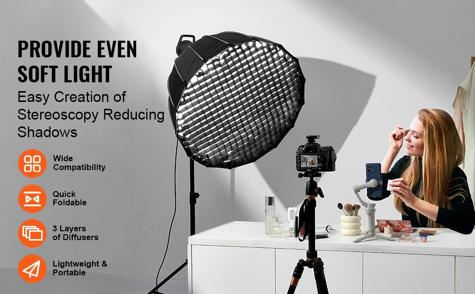 Tämä parabolinen softbox tuottaa tasaisen, pehmeän valon ammattimaiseen kuvaukseen ja päivittäiseen video- ja sisällöntuotantoon. Kevyt ja helposti mukana kulkeva rakenne sopii erilaisiin kuvaustilanteisiin sekä studioon että ulkokuvauksiin.