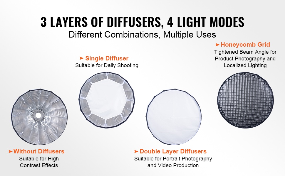 Softbox tarjoaa 4 erilaista valaistustilaa erilaisten kuvaustarpeiden mukaan: ilman diffuusoria, yhdellä diffuusorilla, kaksoisdiffuusiolla sekä hunajakennoritilän kanssa. Näiden yhdistelmien avulla voit säätää valon pehmeyttä ja suuntaavuutta tarkasti kuhunkin tilanteeseen sopivaksi.