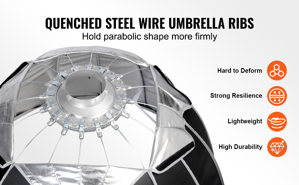 Varjostimen kaaret on valmistettu karkaistusta teräslangasta, mikä parantaa parabolisen muodon pysyvyyttä ja ehkäisee vääntymistä. Rakenne on samalla kevyt ja helppo käsitellä, joten softboxia on miellyttävä käyttää niin studiossa kuin liikkuvassa tuotannossakin.