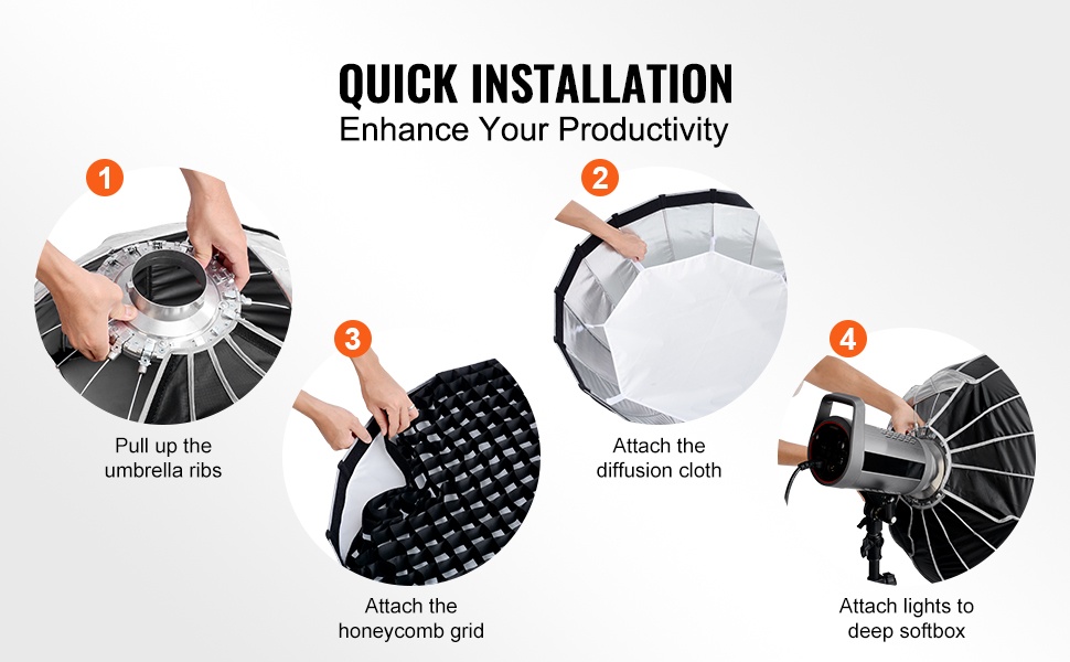Integroitu pikakiinnitysrakenne mahdollistaa nopean asennuksen ja purkamisen. Nosta runko paikalleen, kiinnitä heijastava materiaali tarranauhalla ja lisää tarvittavat diffuusorit. Rakenne helpottaa myös softboxin pakkaamista ja säilytystä.